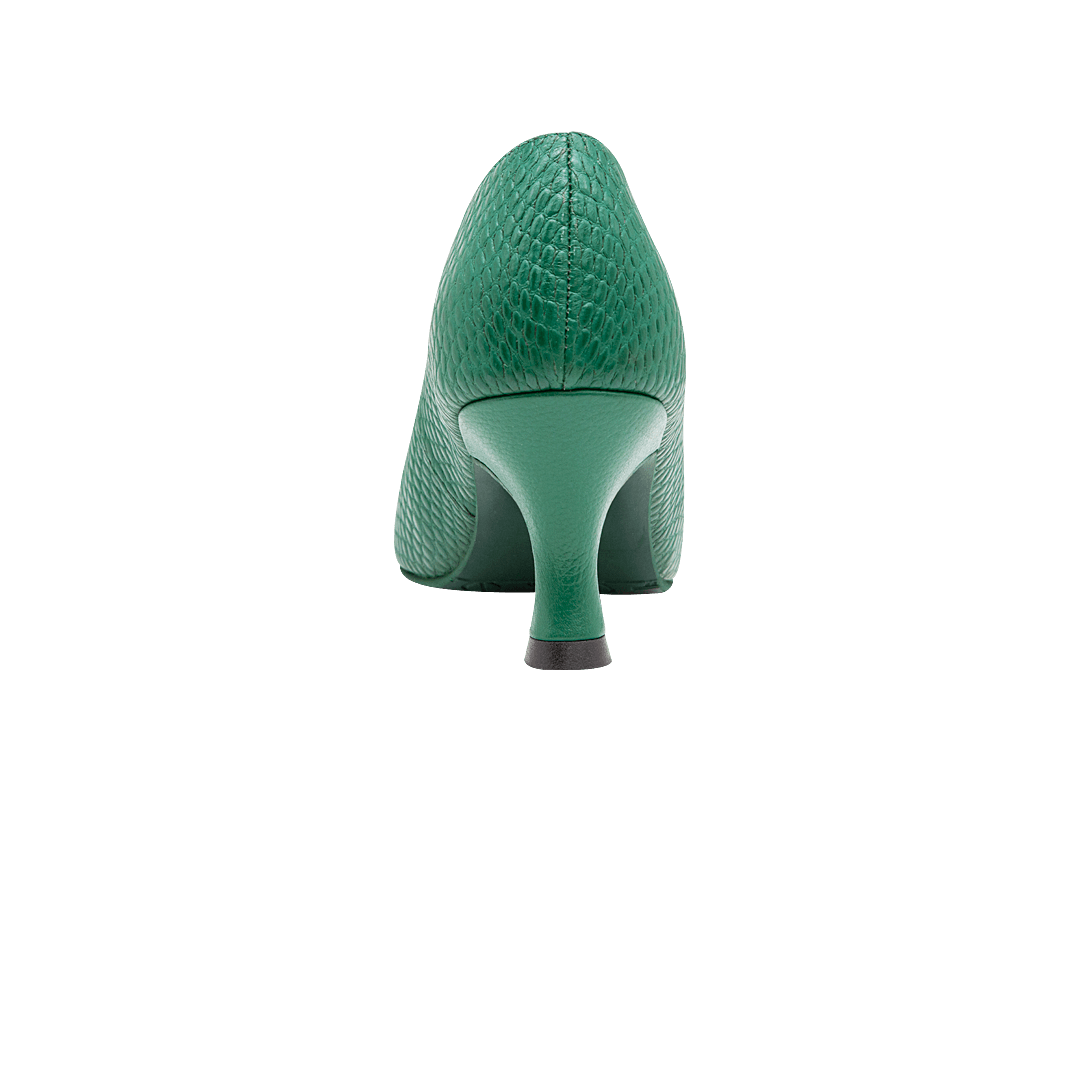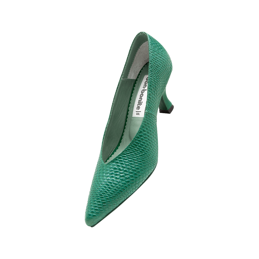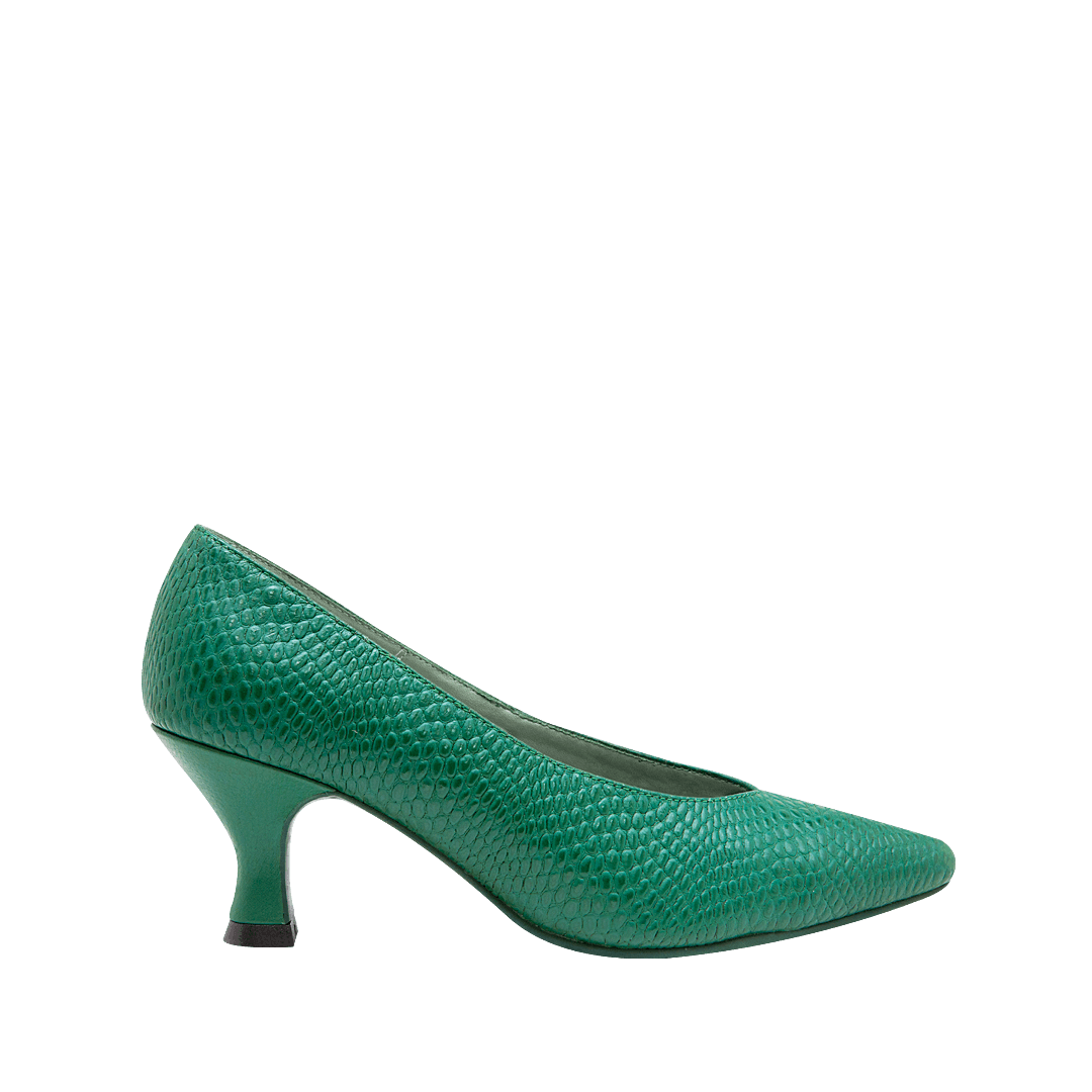 ¡Alarga la figura y aporta un toque de atrevimiento! • Tacón para mujer tipo stiletto en cuero grabado color verde loro • Acabado en punta • Tacón forrado en cuero • Hecho a mano en Colombia.