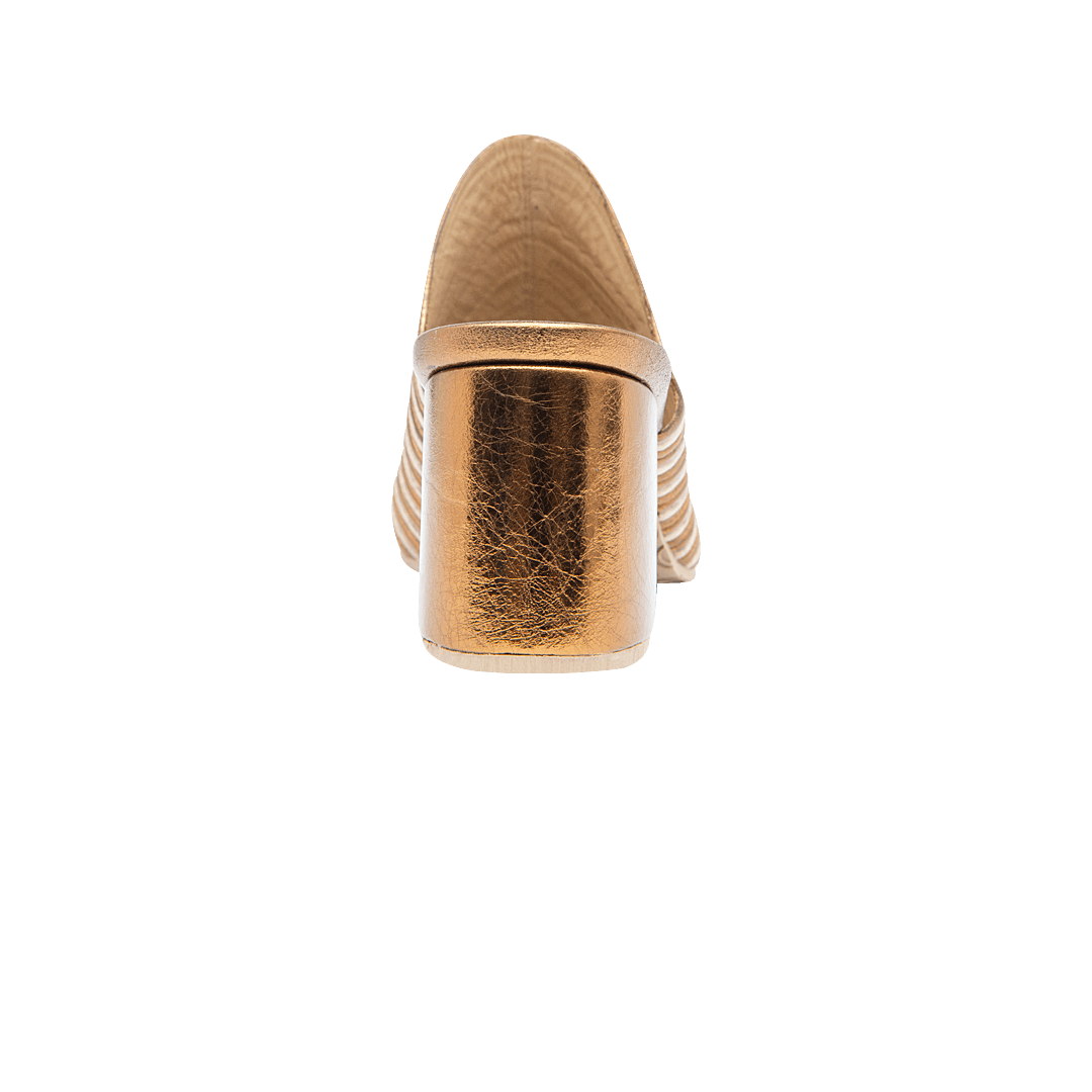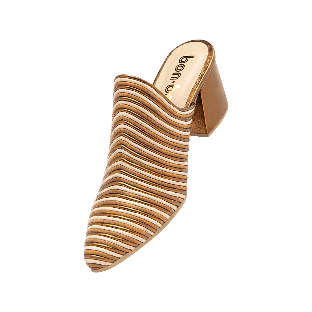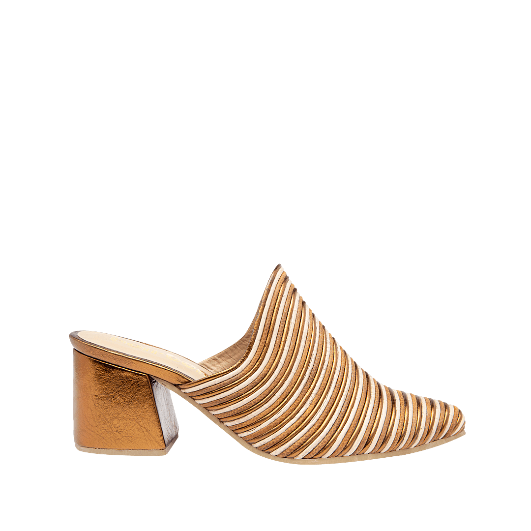 ¡Ideales para elevar tu outfit! • Zueco para mujer en cuero metalizado color arena, bronce y mantequilla • Acabado en punta • Tacón forrado en cuero • Hecho a mano en Colombia.