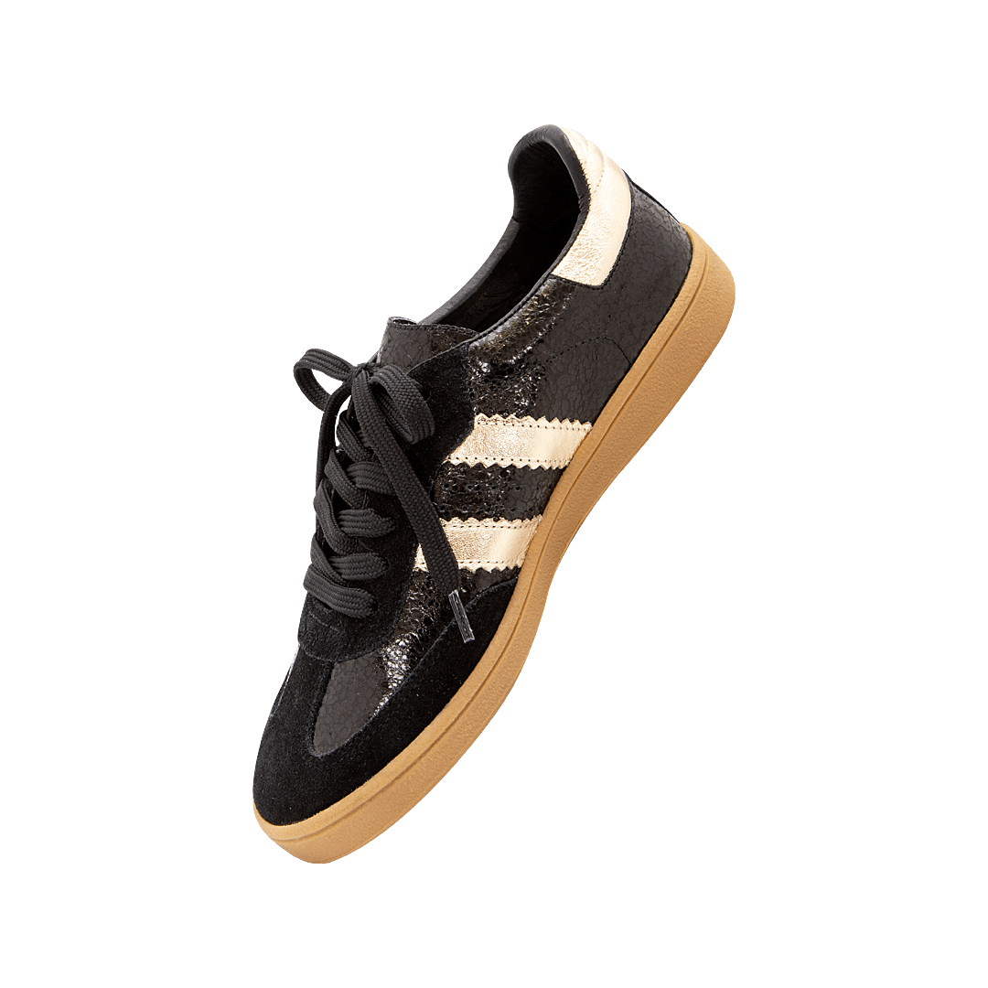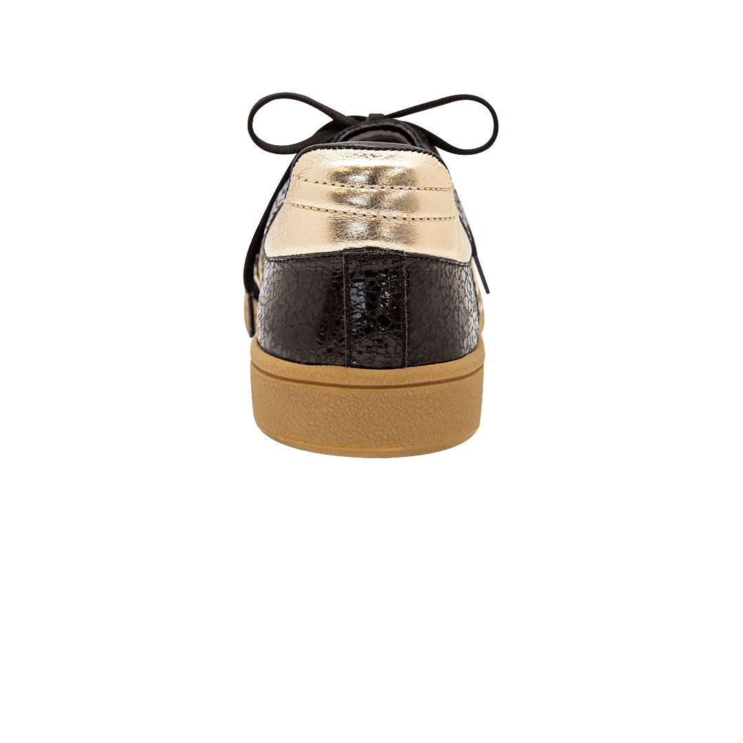 ¡Pasos osados! • Tenis en cuero folia color negro ónix • Detalles en cuero color oro nuevo • Acabado en punta redonda • Forro en piel • Plantilla en textil • Plataforma de 2 1/2 cm • Suela en caucho • Hecho a mano en Colombia.
