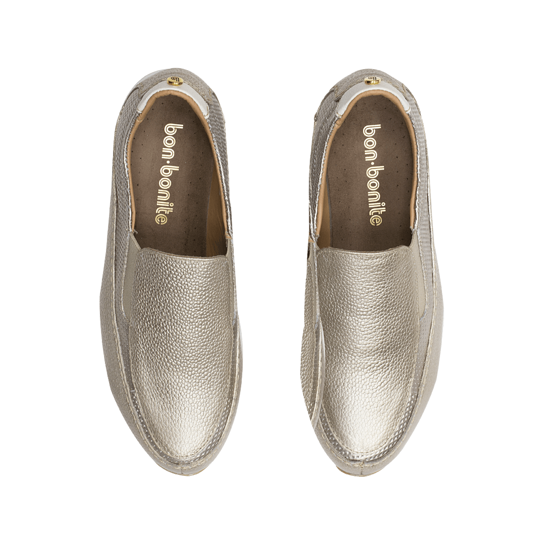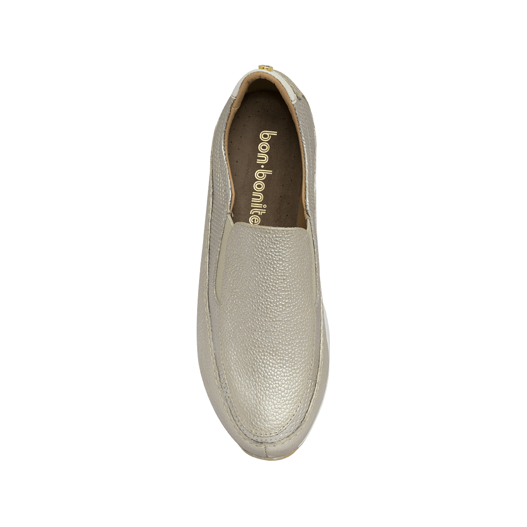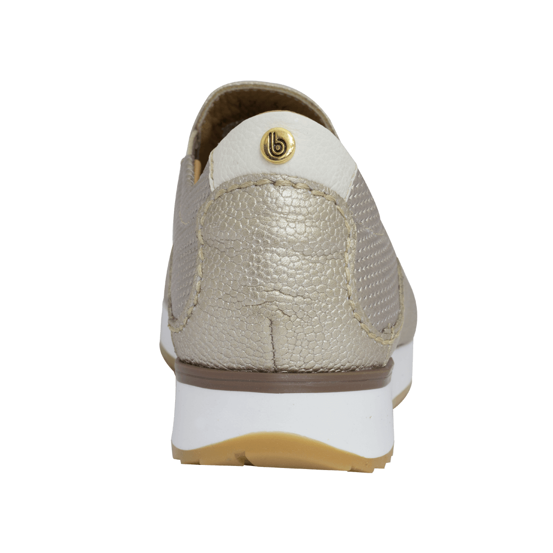 ¡Máxima comodidad! • Tenis tipo mocasín • Cuero granito y perforado • Forro en piel • Elásticos laterales para un mejor ajuste • Talonera color blanco crema en cuero napa • Placa bañada en oro con la letra “b” de nuestro logo • Plantilla en cuero • Plataforma de 3 cm en TR • Suela semi tractorada en caucho para mayor comodidad • Hecho en Colombia • Colores disponibles: pluma, platino, miel caña y blanco puro.