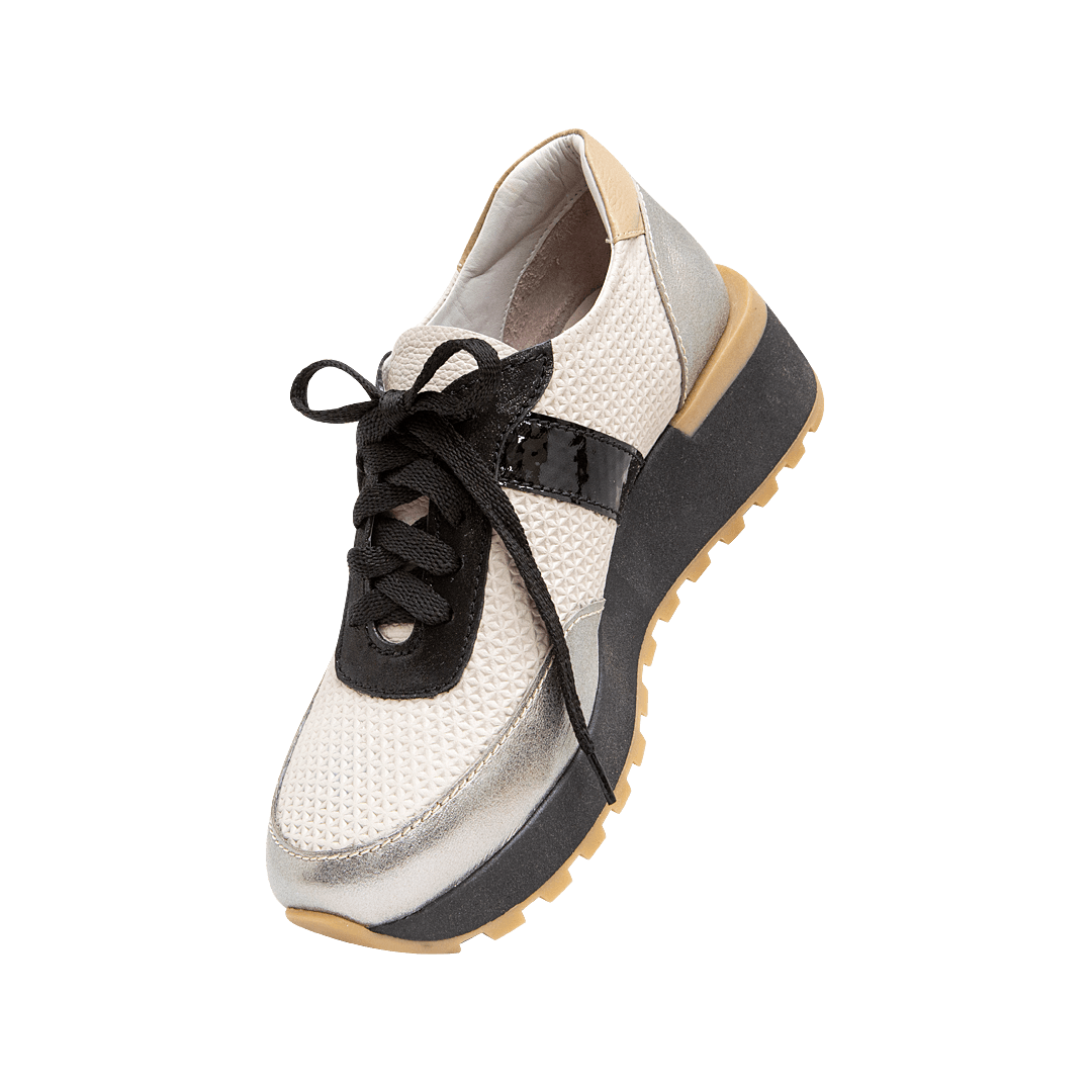 ¡Comodidad y estilo! • Tenis de plataforma en mezcla de cuero grabado, metalizado y charolado color blanco por fusil y negro ónix • Acabado en punta redonda • Cordones en textil • Plataforma dentada de 5 cm • Hecho a mano en Colombia.