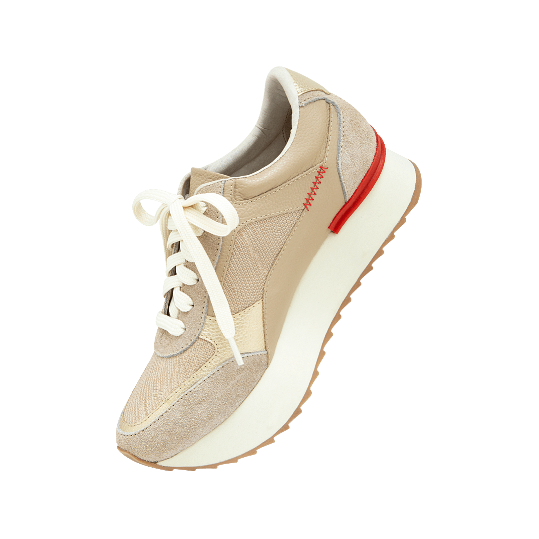 ¡Combinan con todo! • Tenis de plataforma para mujer en cuero granito, carnaza y grabado color pardo, latte y oro nuevo • Acabado en punta ovalada • Cordones en algodón • Hecho a mano en Colombia.