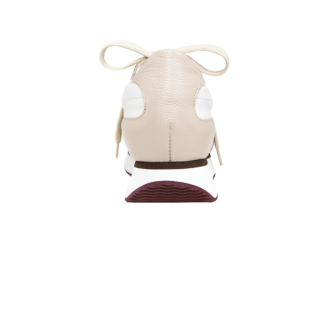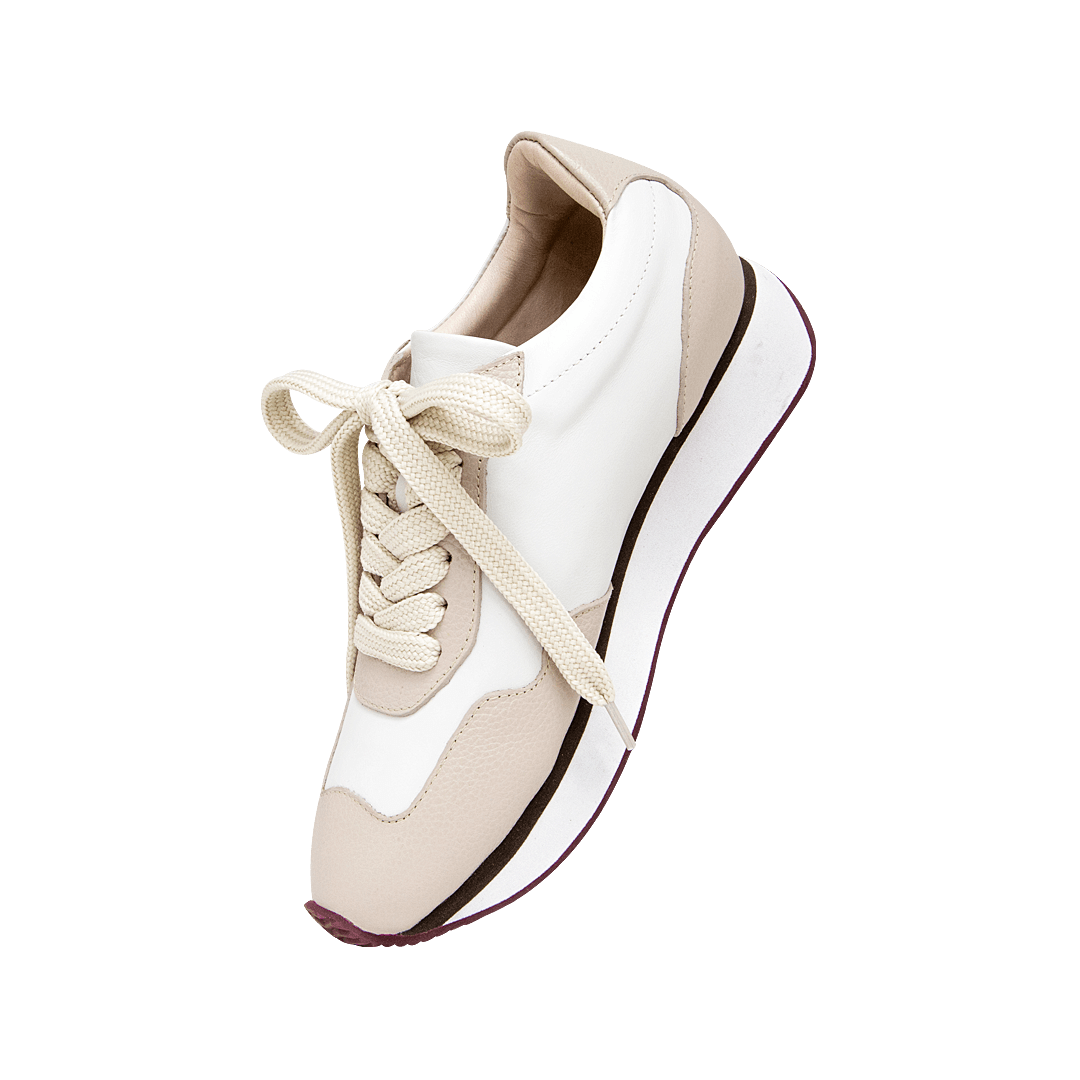 ¡Versátil y con estilo! • Tenis de plataforma para mujer en cuero liso color blanco crema por arena y vino • Acabado en punta ovalada • Cordones en textil • Hecho a mano en Colombia.