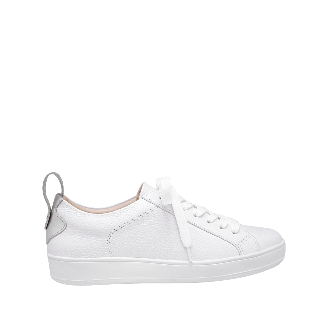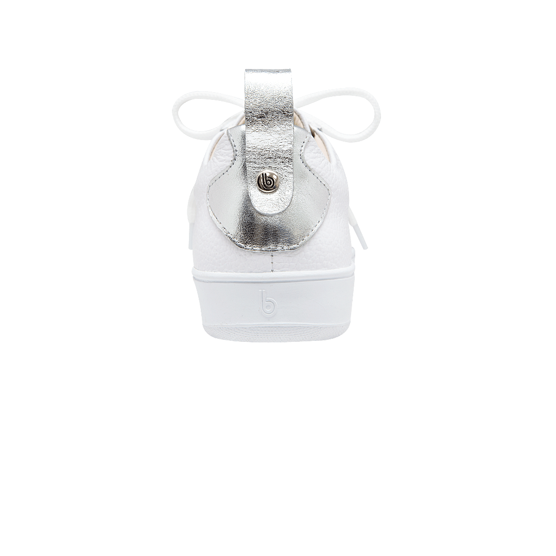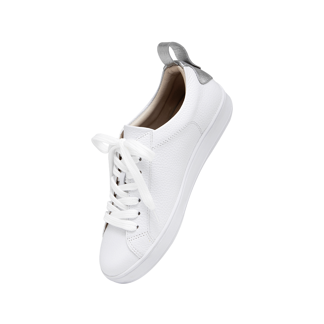 ¡Comodidad y estilo en cada paso! • Tenis para mujer en cuero granito color blanco puro • Tirador trasero en cuero metalizado color plata • Acabado en punta ovalada • Cordones en textil • Hecho a mano en Colombia.