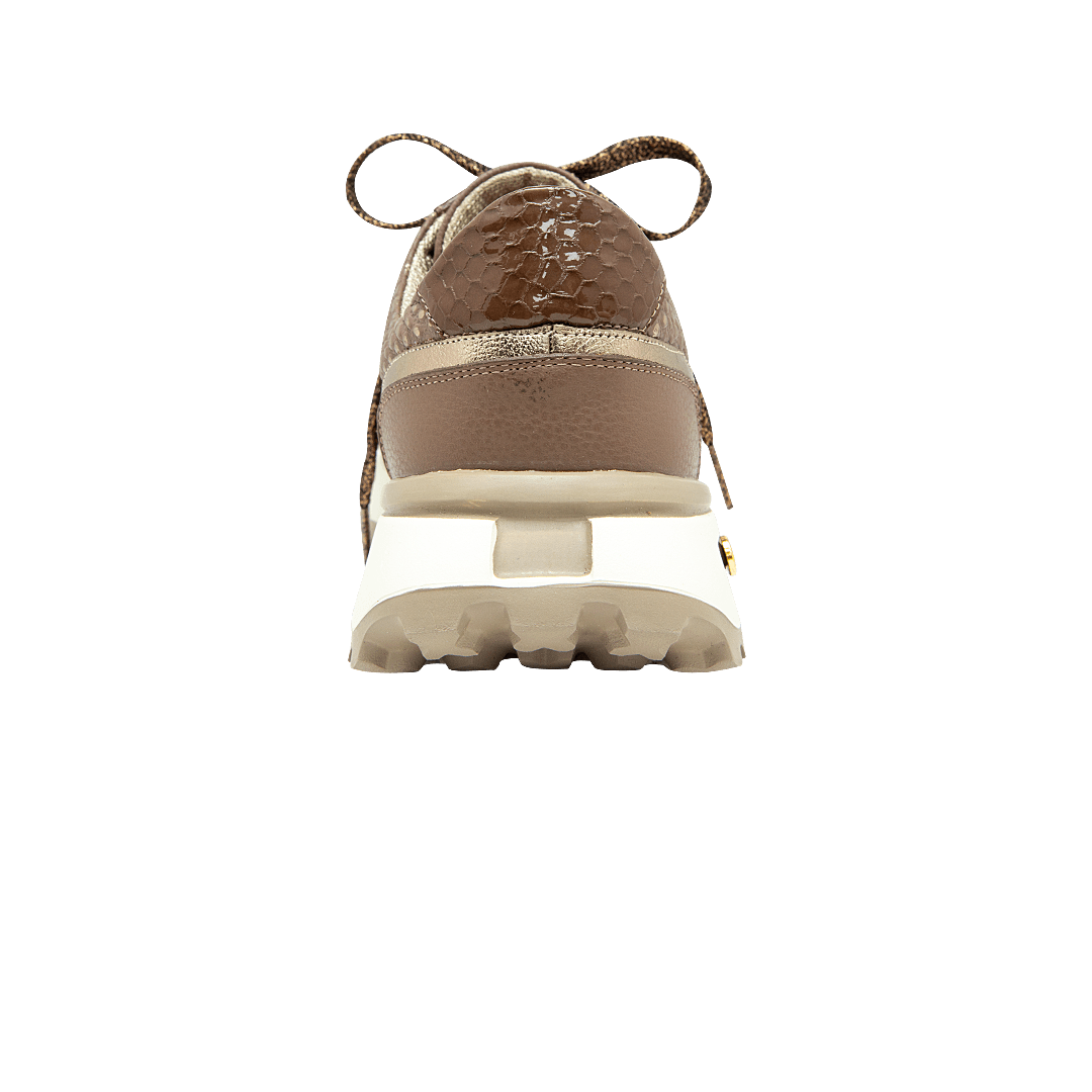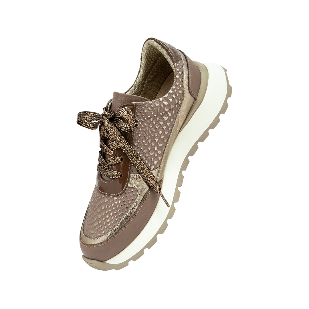 ¡Combina estilo y comodidad en cada paso! • Tenis para mujer en cuero grabado, metalizado y granito color gama chocolate • Acabado en punta ovalada • Cordones en textil metalizado • Suela tractorada • Hecho a mano en Colombia.