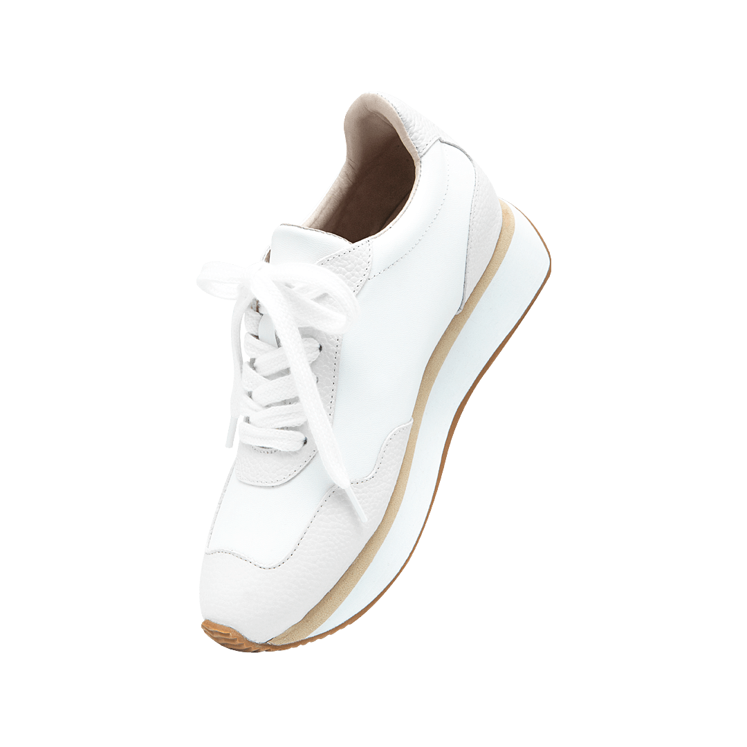 ¡Versátil y con estilo! • Tenis de plataforma para mujer en mezcla de cuero liso y granito color blanco crema • Acabado en punta ovalada • Cordones en textil • Hecho a mano en Colombia.