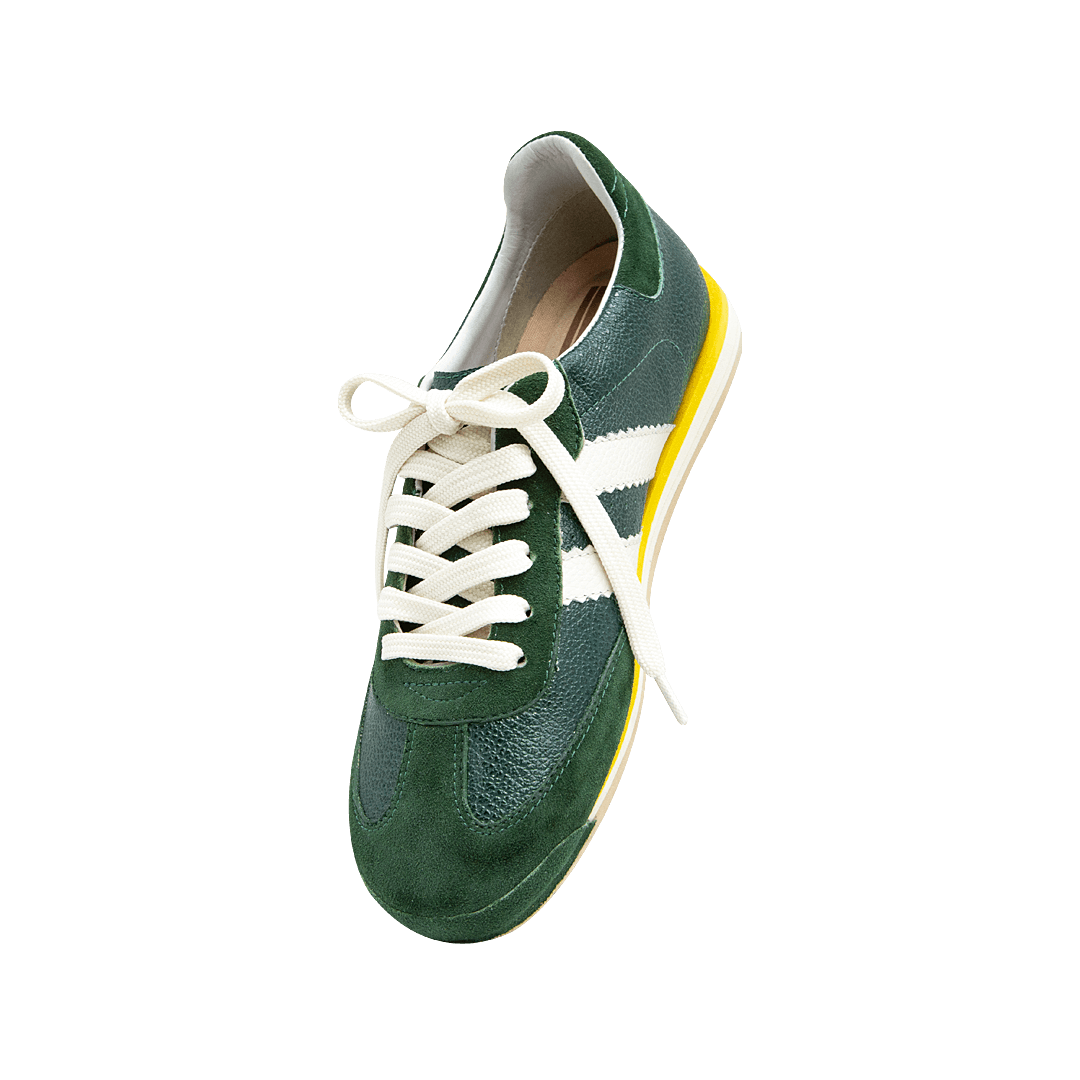 ¡Estilo sin límites! • Tenis planos para mujer en mezcla de cuero granito y carnaza color verde pino • Acabado en punta redonda • Laterales en cuero color blanco • Cordones en textil • Hecho a mano en Colombia.