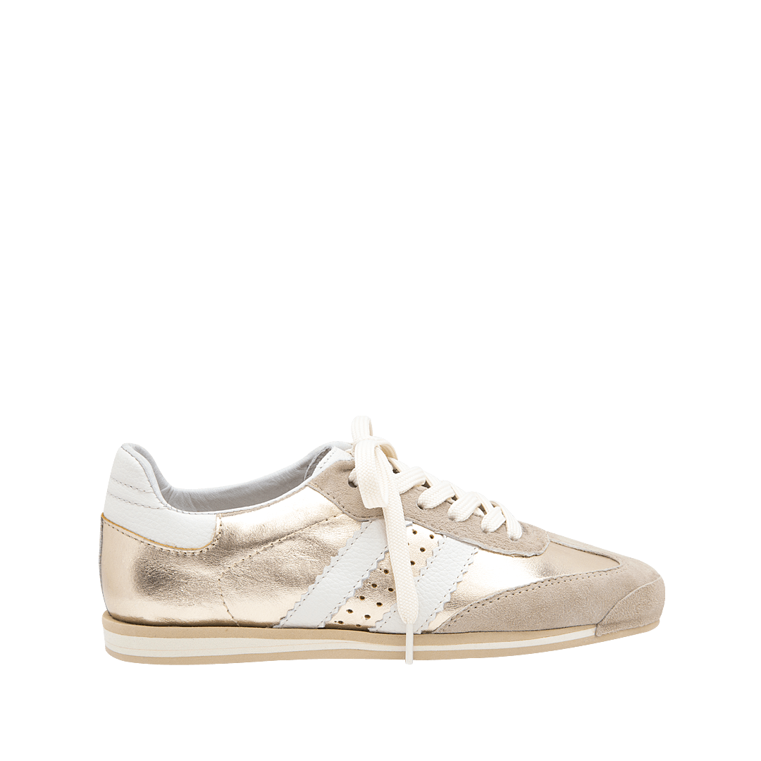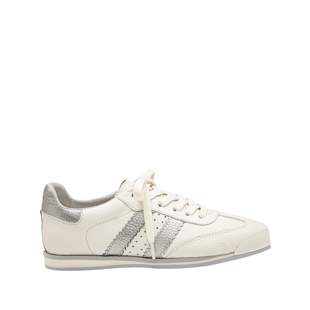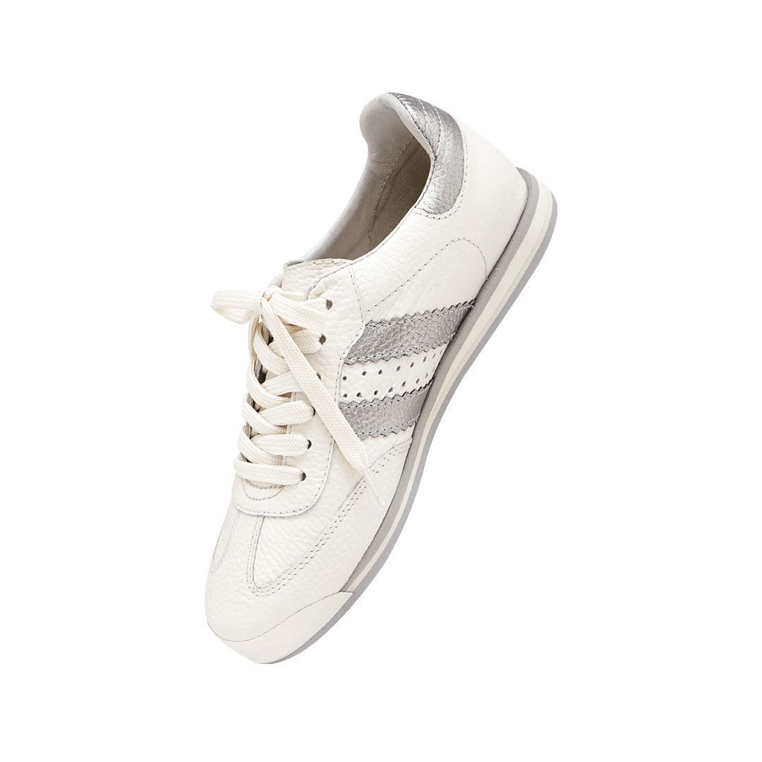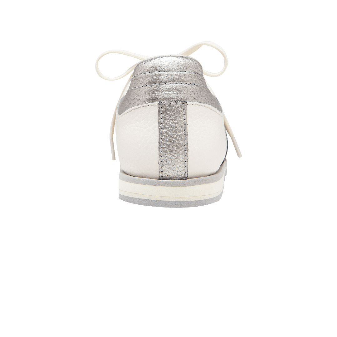 ¡Estilo sin límites! • Tenis planos para mujer en mezcla de cuero granito y metalizado color blanco crema por metal plomo • Acabado en punta redonda • Laterales en cuero color metal plomo • Cordones en textil • Hecho a mano en Colombia.