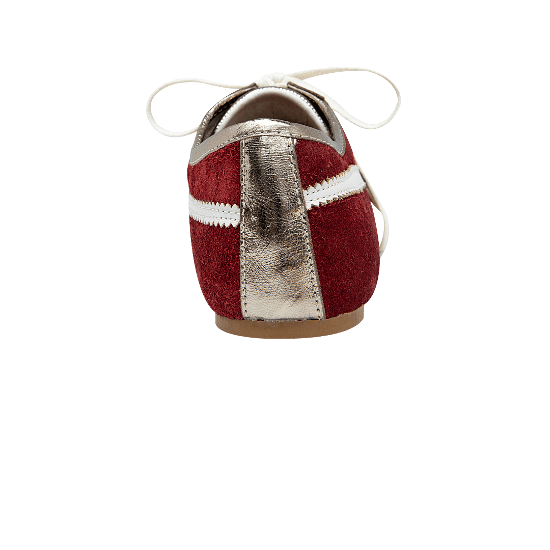 ¡Enamoran al primer paso! • Tenis planos para mujer en mezcla de cuero carnaza, granito y metalizado color rojo carmesí por luna • Acabado en punta ovalada • Laterales en cuero color concha • Cordones en textil • Hecho a mano en Colombia.