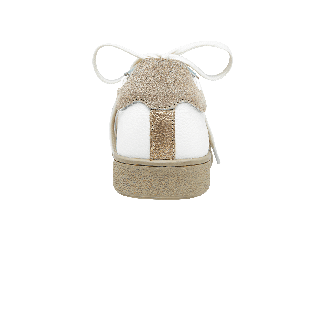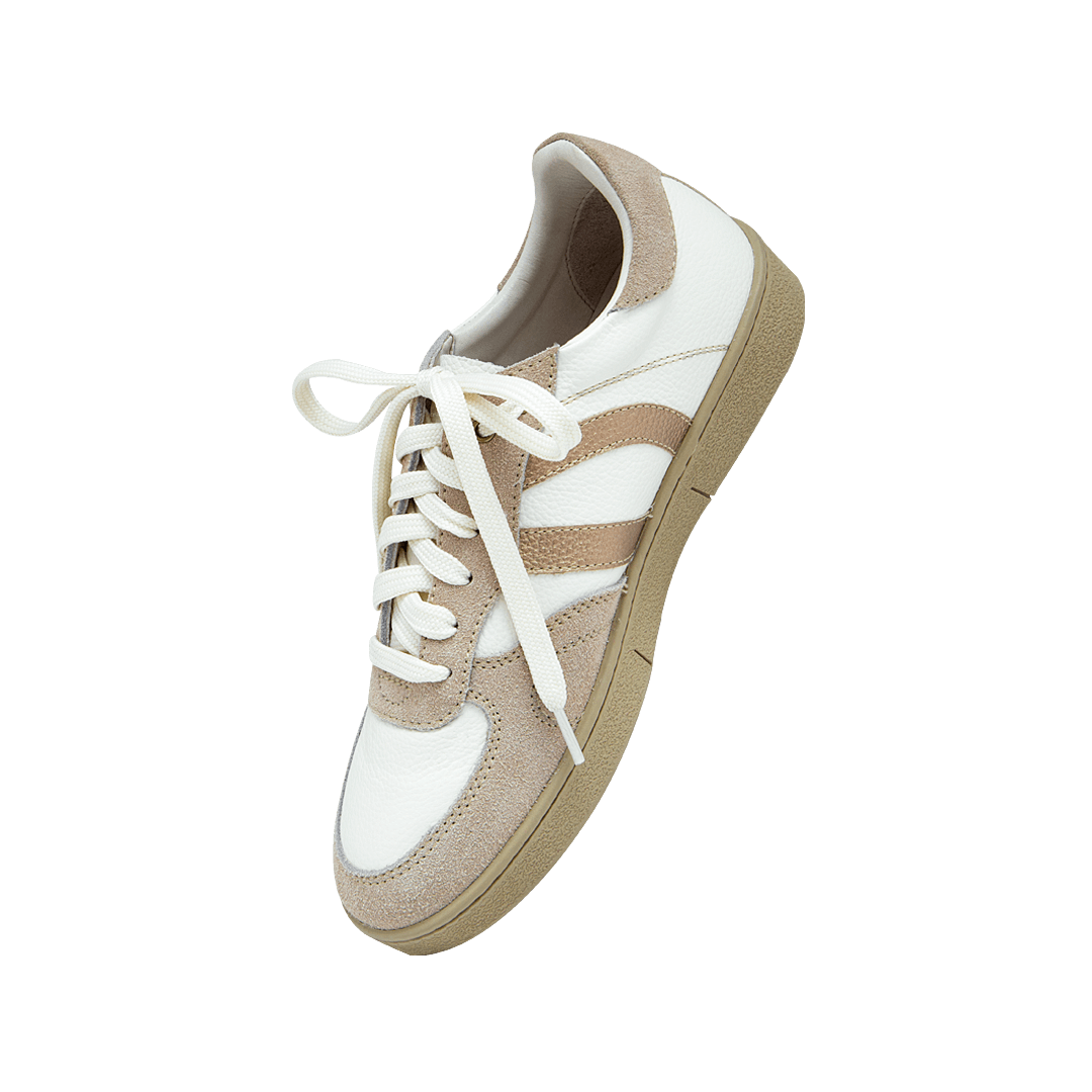 ¡Dos tonos, una sola actitud! • Tenis para mujer en mezcla de cuero carnaza, granito y metalizado color chantilly por arena • Acabado en punta redonda • Laterales en cuero color luna • Cordones en textil • Hecho a mano en Colombia.