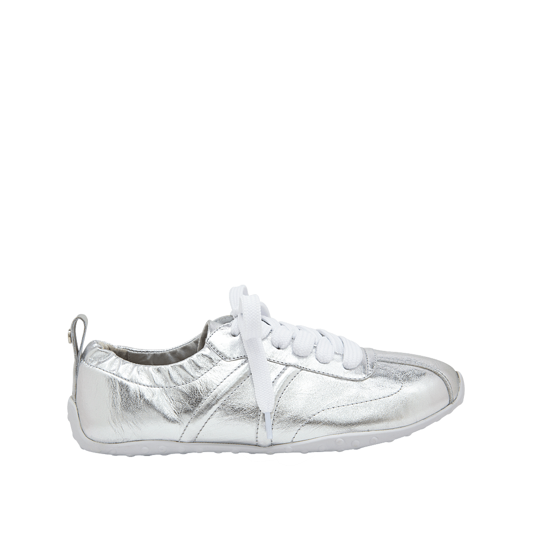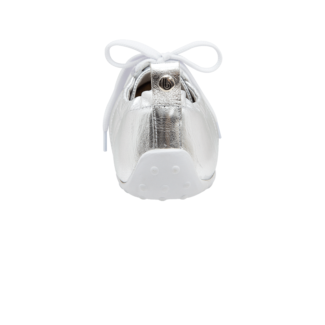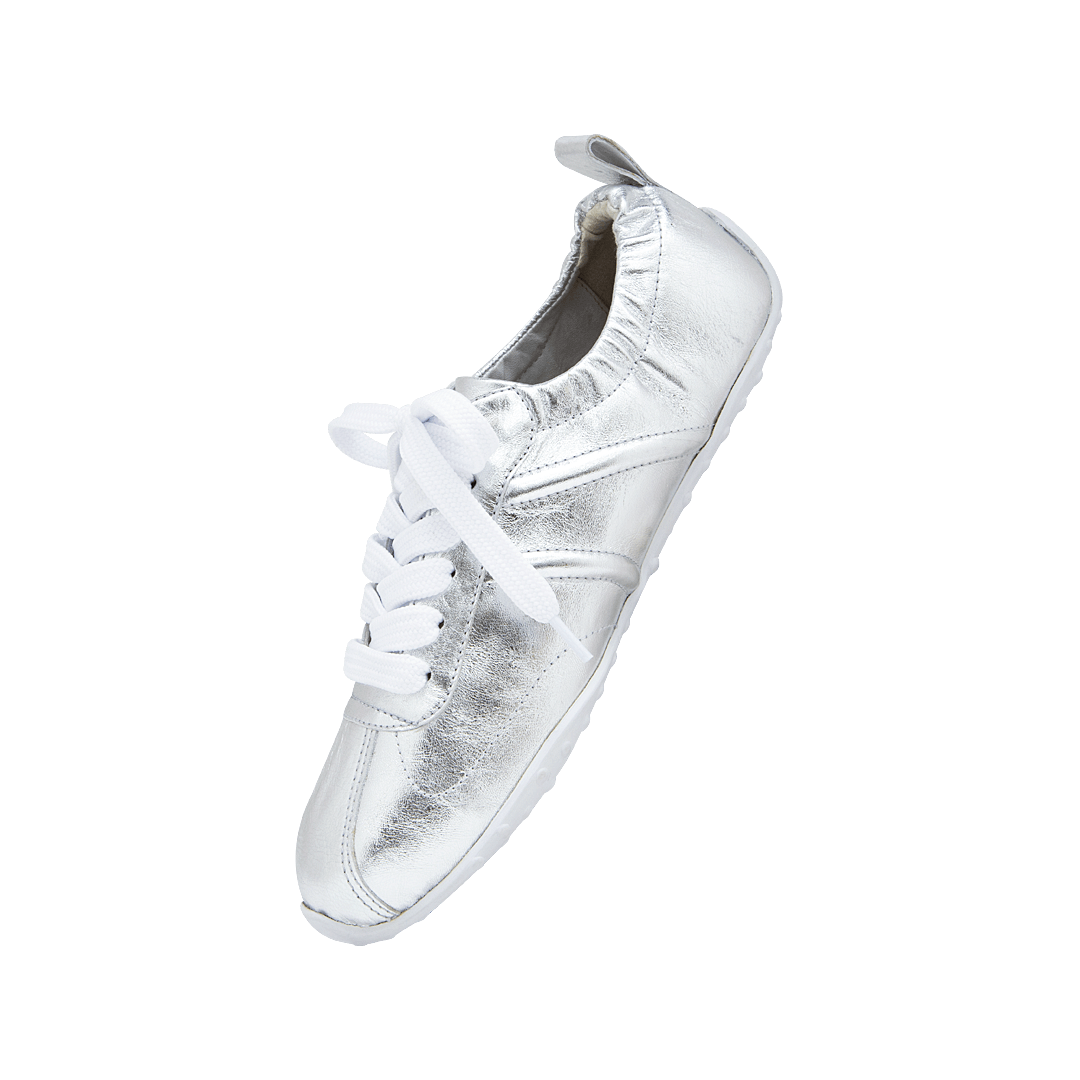 ¡Estilo en cada paso! • Tenis planos para mujer en cuero metalizado color plata • Acabado en punta redonda • Cordones en textil • Hecho a mano en Colombia.