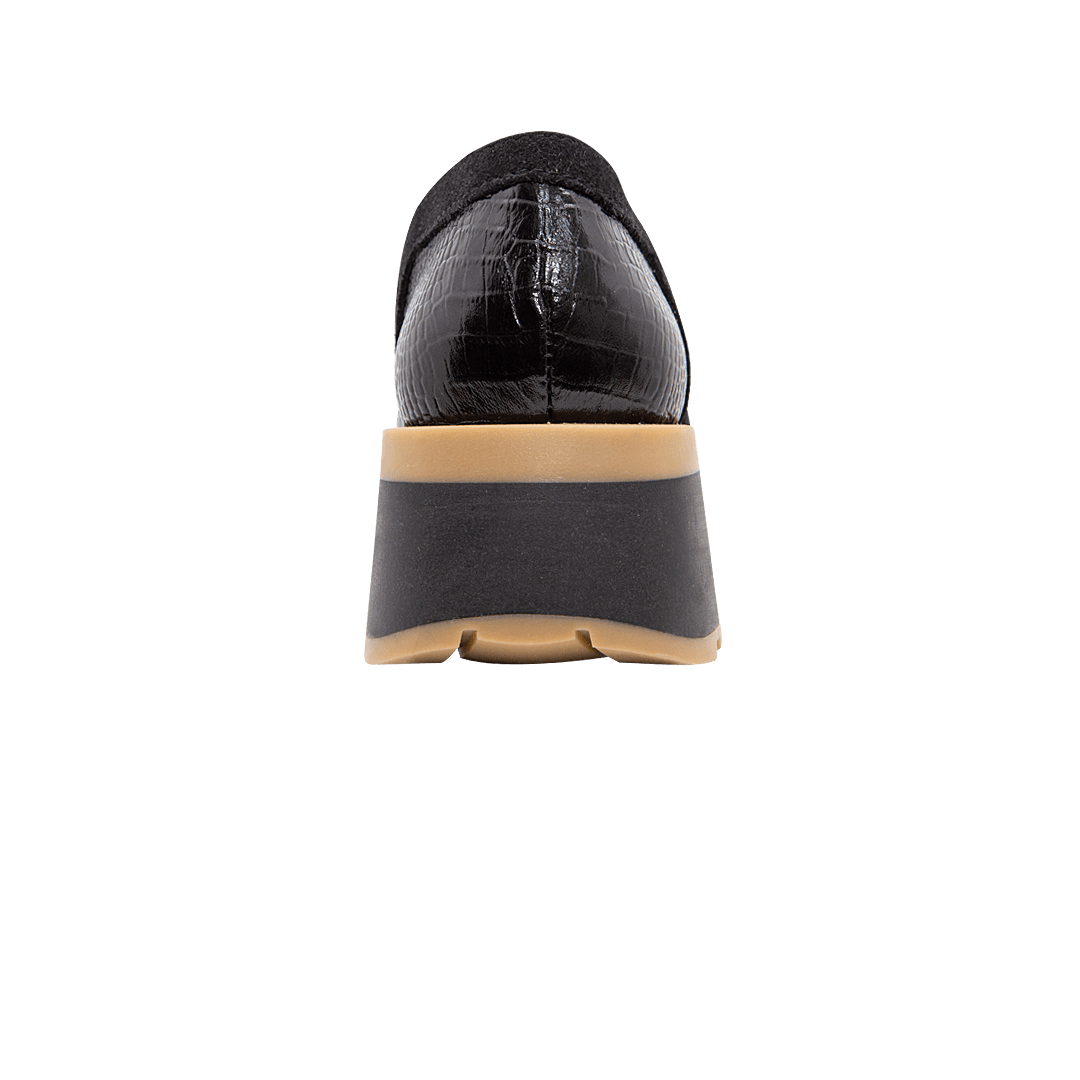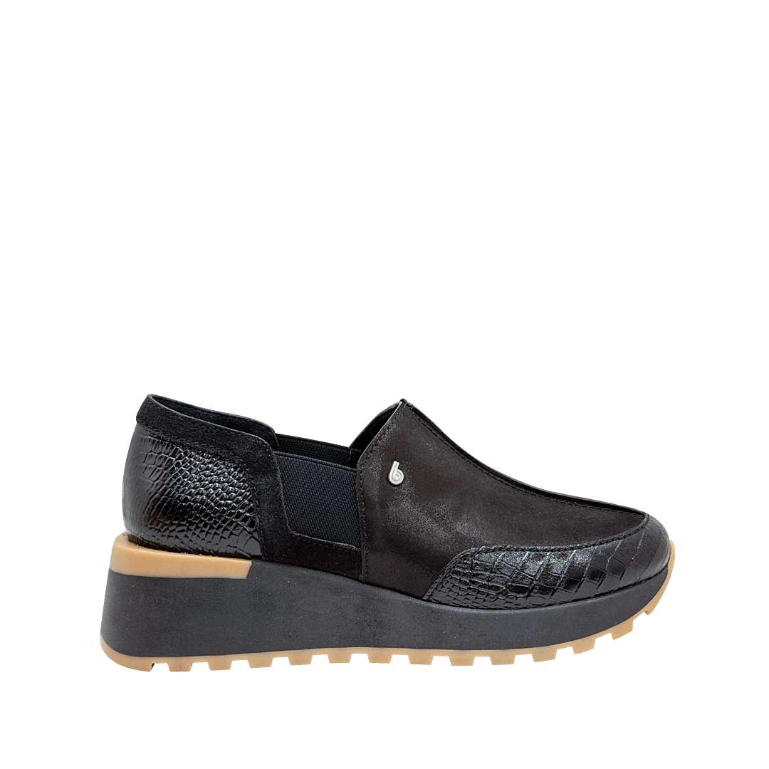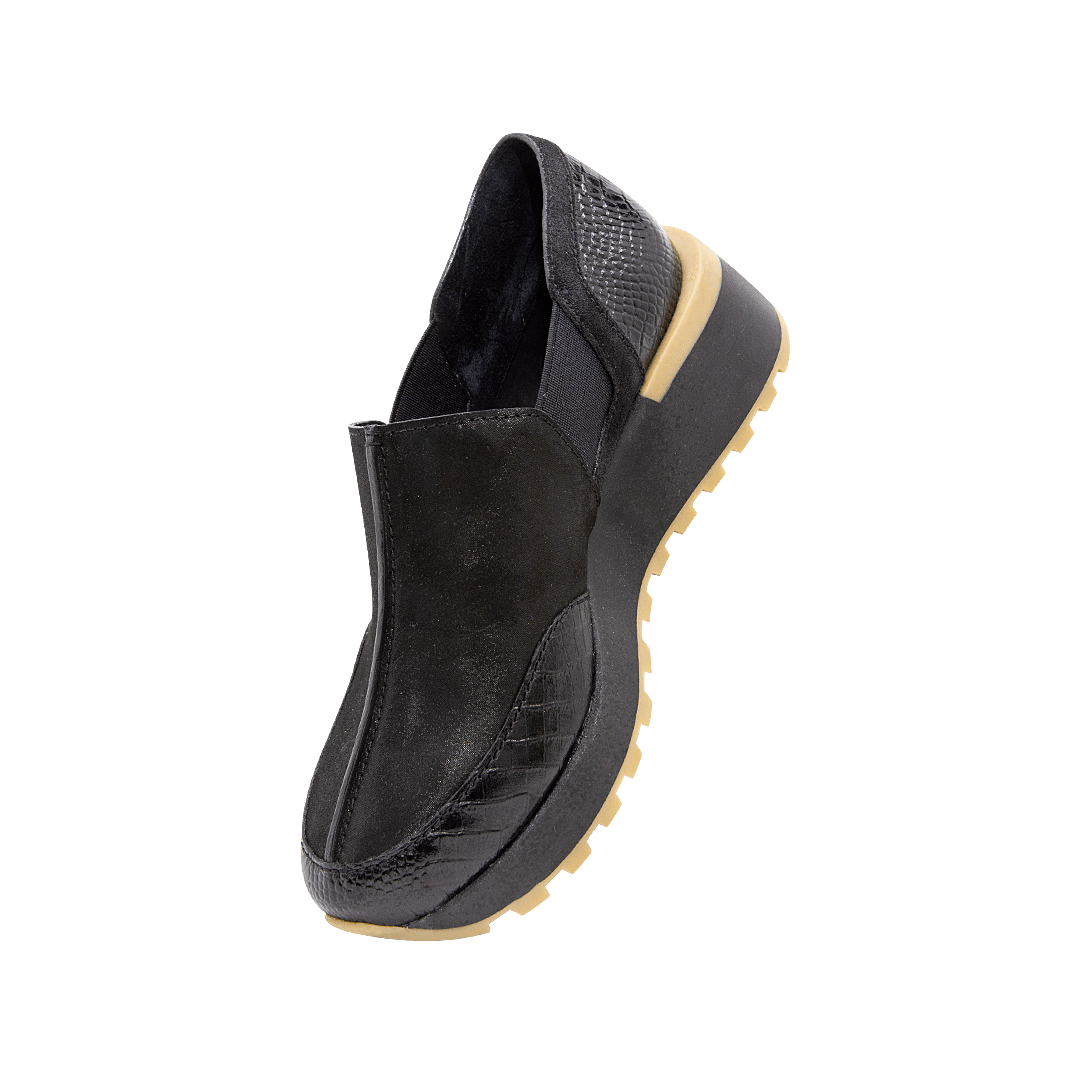 ¡Pisa fuerte, incluso en los días más ligeros! • Tenis sin cordón para mujer en cuero grabado, folia y gamuza color negro ónix • Acabado en punta ovalada • Elástico laterales para mejor ajuste • Hecho a mano en Colombia.