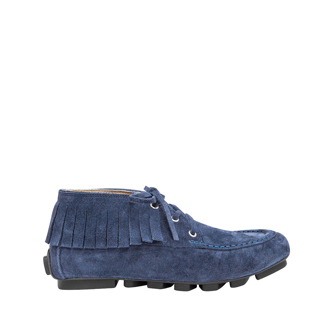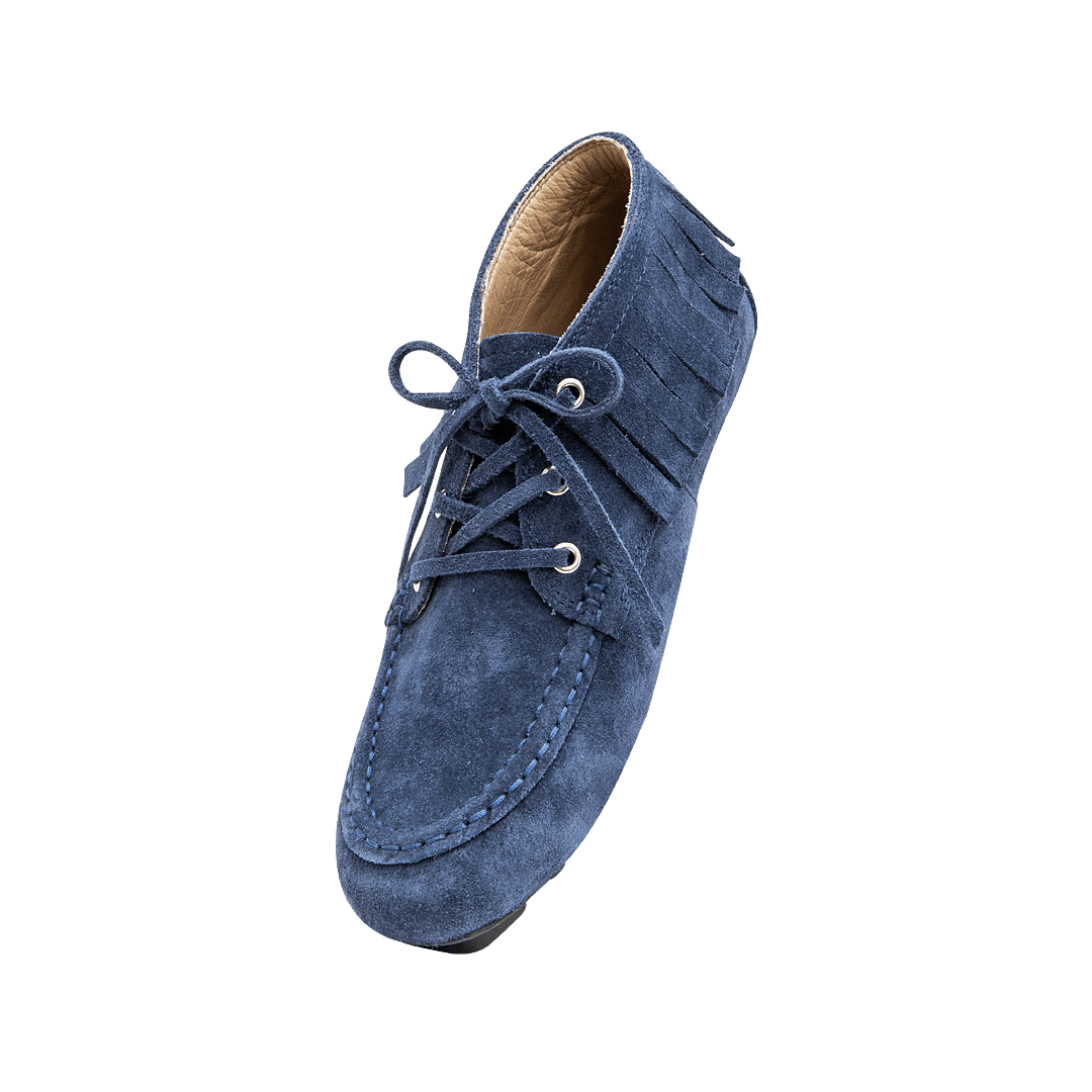 ¡Perfecto para las que aman marcar la diferencia! • Zapato de atadura con flecos en cuero carnaza color azul índigo • Acabado en punta redonda • Cordones en cuero • Mini tacón en caucho • Hecho a mano en Colombia.