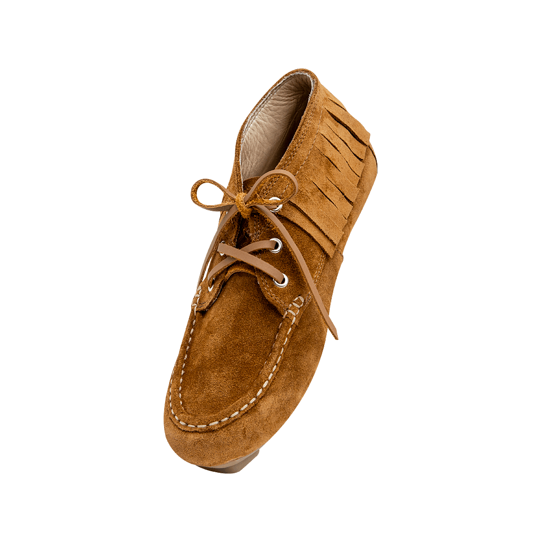 ¡Perfecto para las que aman marcar la diferencia! • Zapato de atadura con flecos en cuero carnaza color cognac • Acabado en punta redonda • Cordones en cuero • Mini tacón en caucho • Hecho a mano en Colombia.
