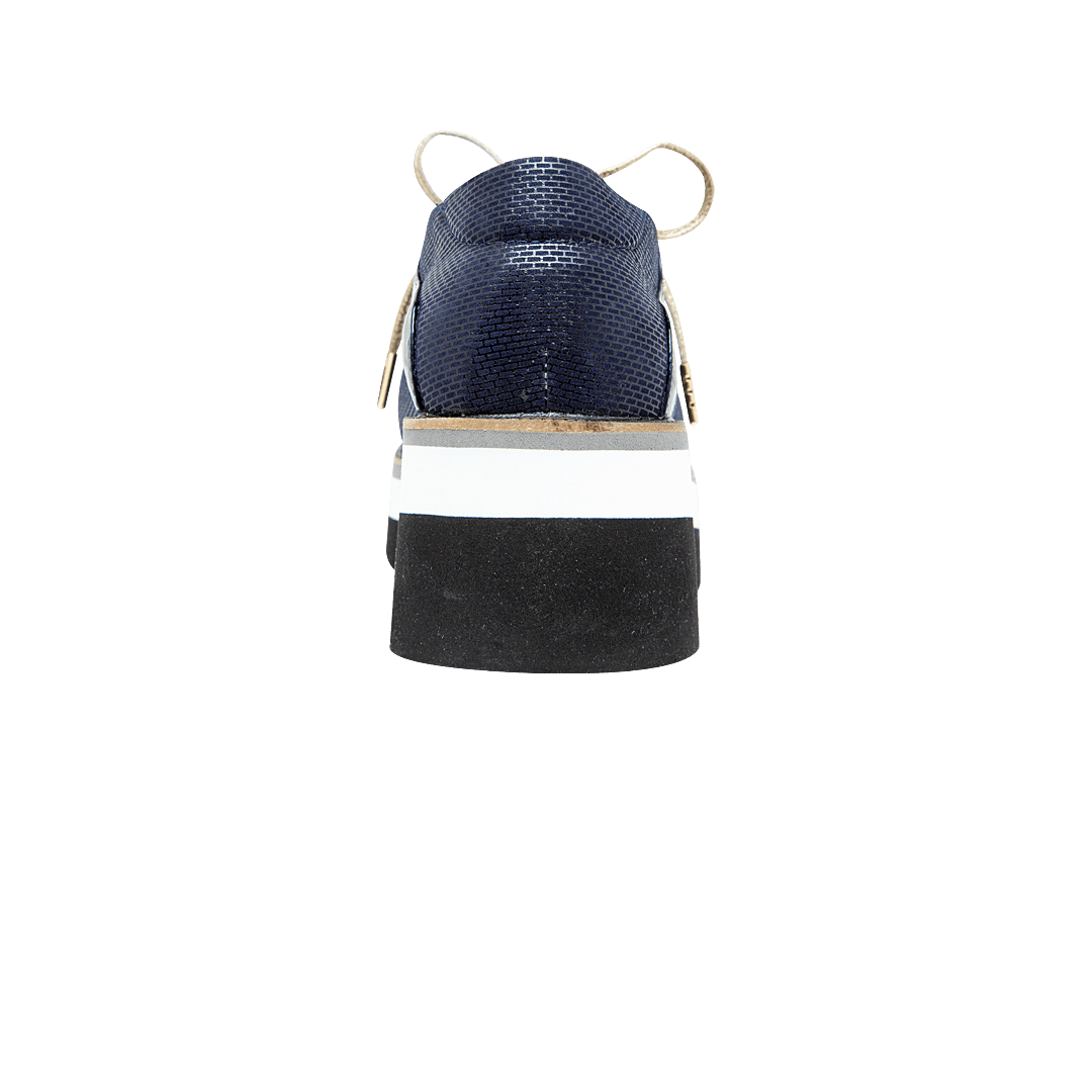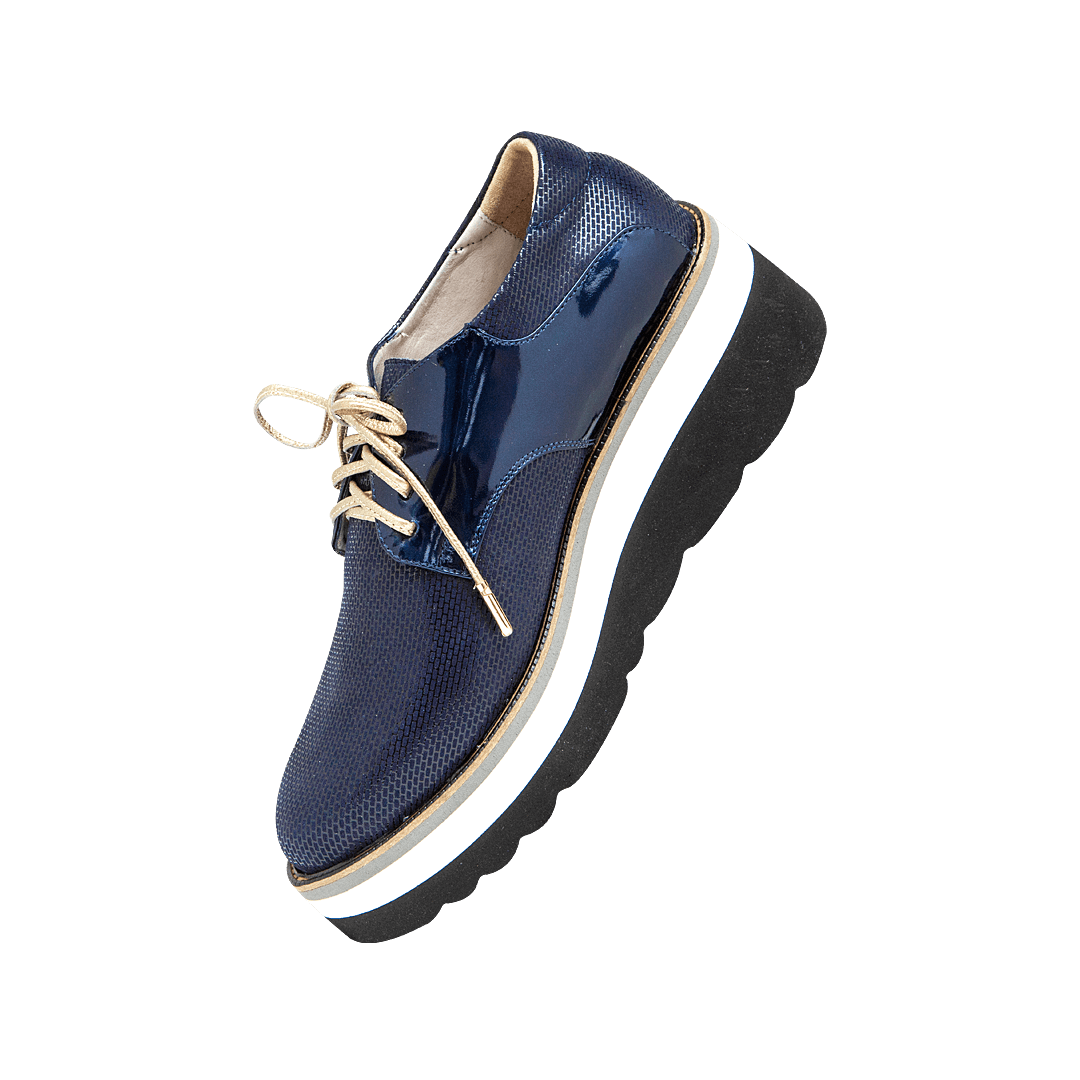 ¡Ideal para el uso cotidiano! • Zapato de atadura para mujer en cuero grabado y liso charolado color azul oscuro • Acabado en punta ovalada • Cordones en cuero con punteras metálicas en cuero color oro • Plataforma liviana en Eva • Hecho a mano en Colombia.