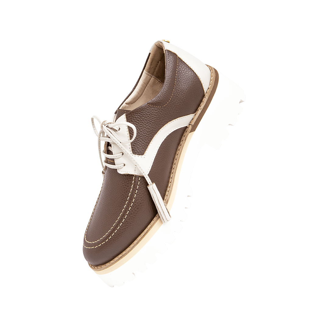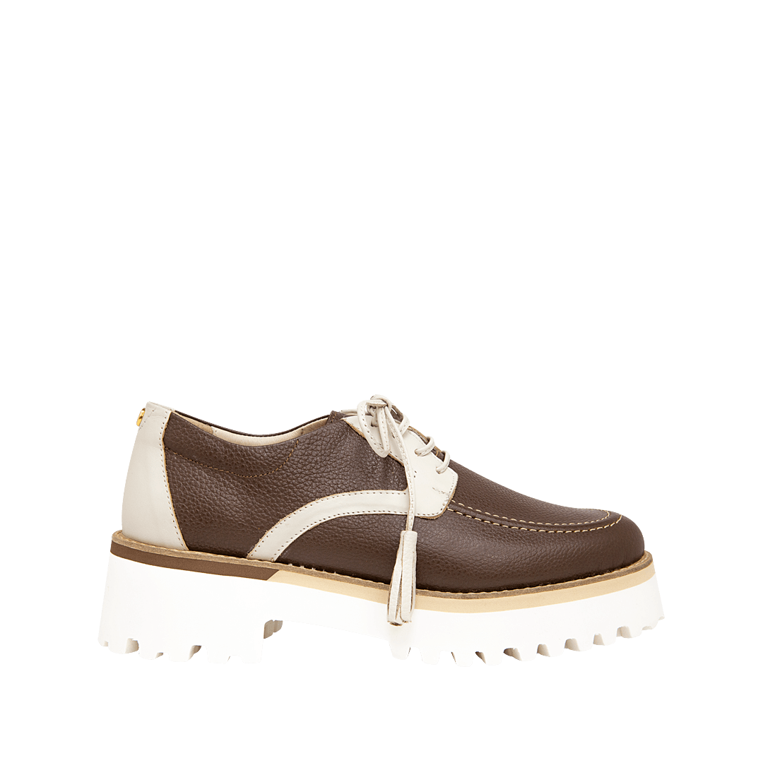 ¡Elegante y fuerte! • Zapato de atadura con plataforma para mujer en mezcla de cuero granito y liso color cacao por concha • Acabado en punta ovalada • Cordones en cuero con punteras en flecos • Plataforma dentada en Eva • Hecho a mano en Colombia.