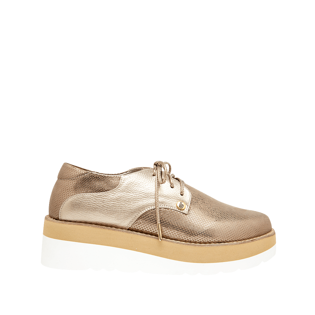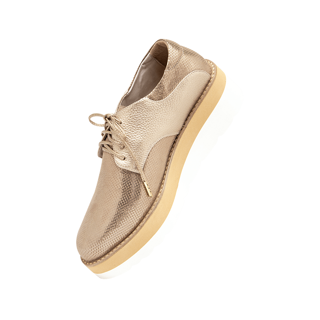 ¡Ideal para el uso cotidiano! • Zapato de atadura para mujer en cuero metalizado y liso color luna • Acabado en punta ovalada • Cordones en cuero con punteras metálicas en cuero color oro • Plataforma liviana en Eva • Hecho a mano en Colombia.
