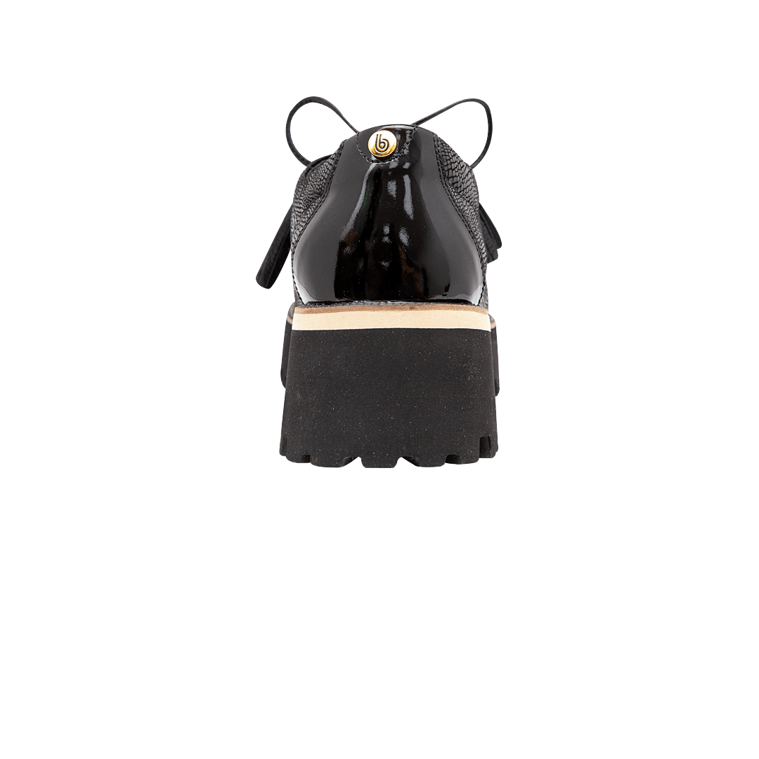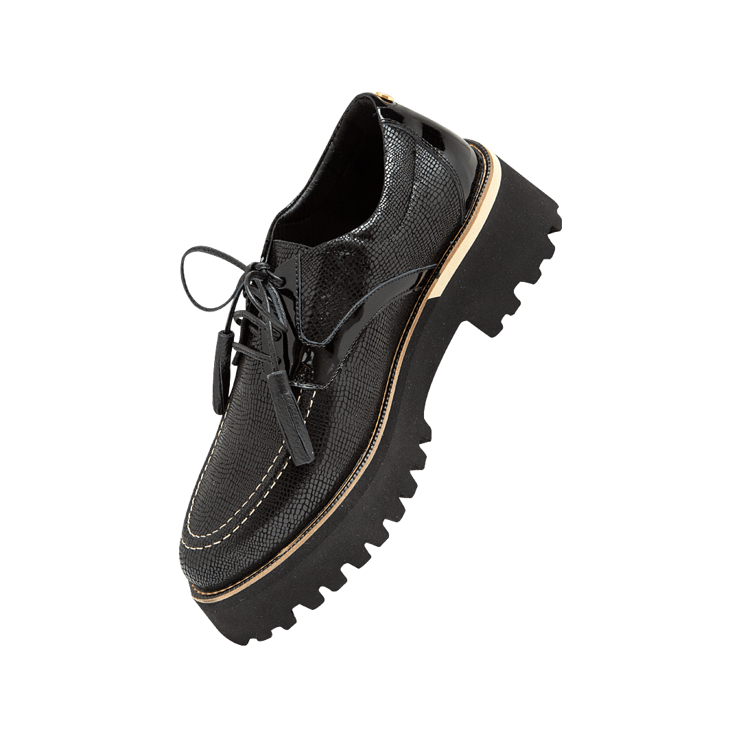 ¡Perfecto para las que aman marcar la diferencia! • Zapato de atadura con plataforma para mujer en mezcla de cuero grabado y charol color negro ónix • Acabado en punta ovalada • Cordones en cuero con punteras en flecos • Plataforma dentada en Eva • Hecho a mano en Colombia.