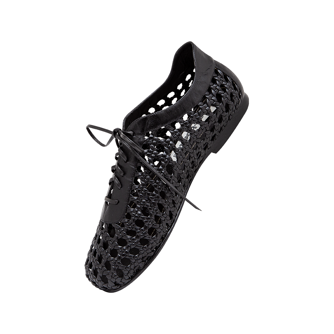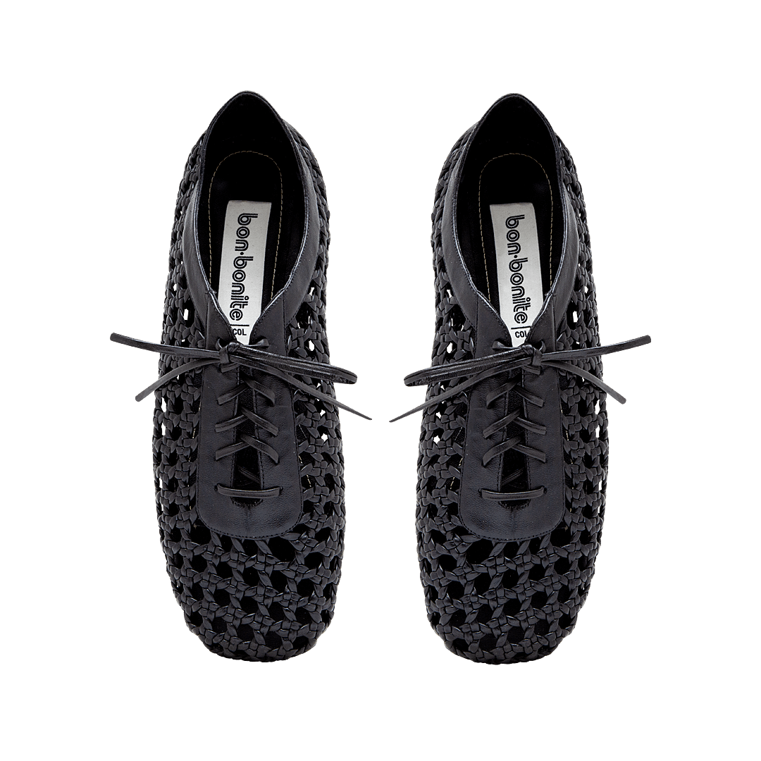 ¡El complemento ideal para cualquier ocasión! • Zapato de atadura para mujer en cuero tejido de manera artesanal color negro ónix • Cordón en cuero • Acabado en punta cuadrada • Mini tacón en caucho • Hecho a mano en Colombia.