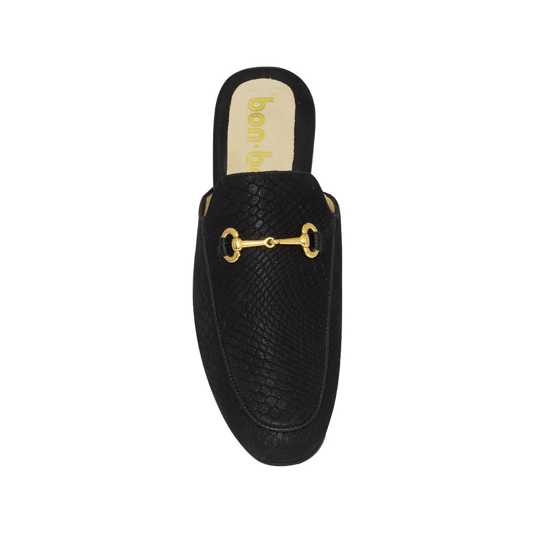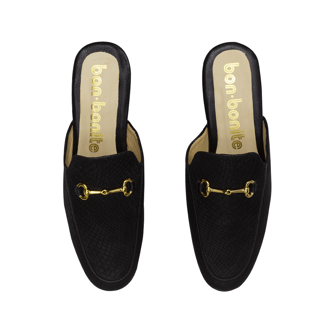 Zueco color negro ónix en cuero grabado folia