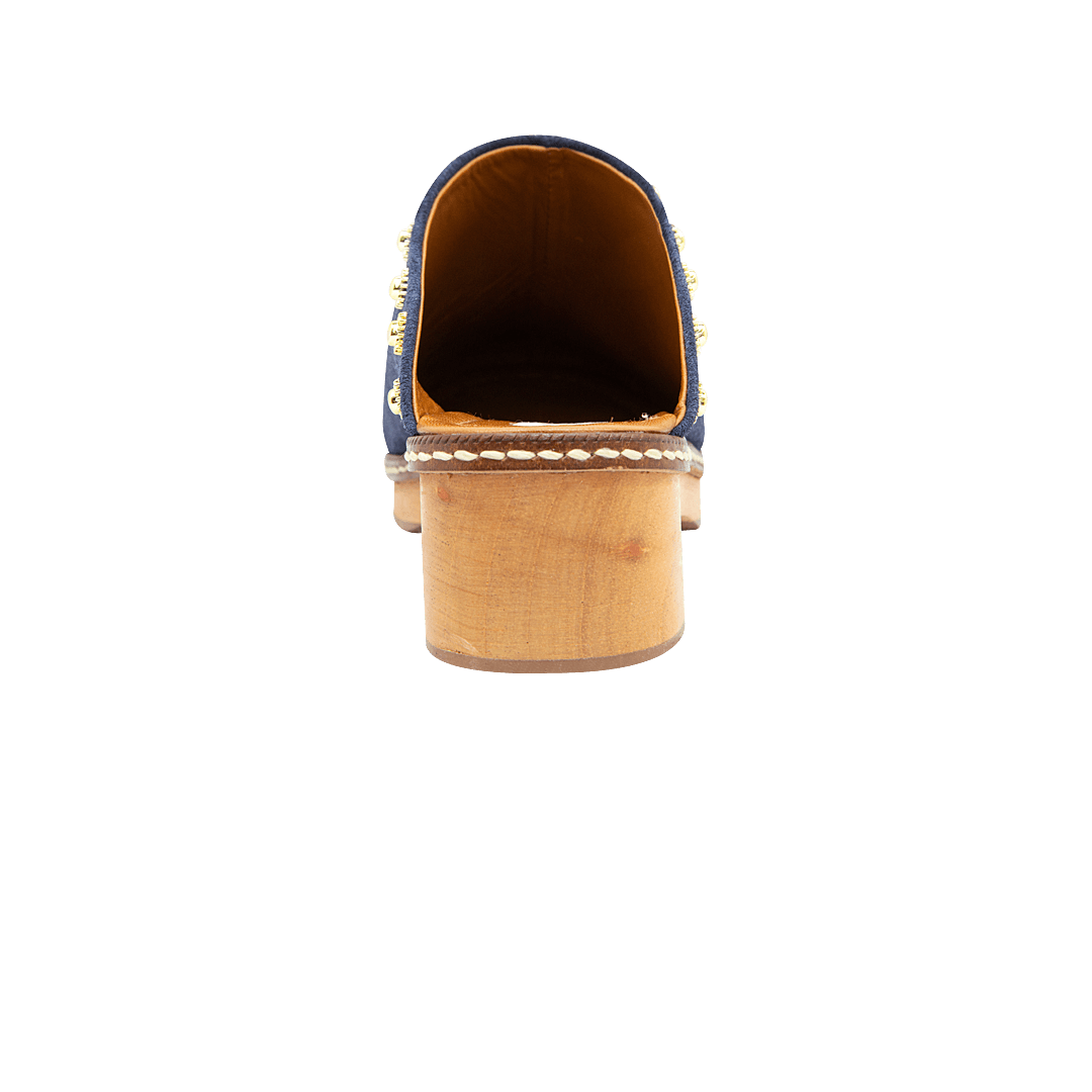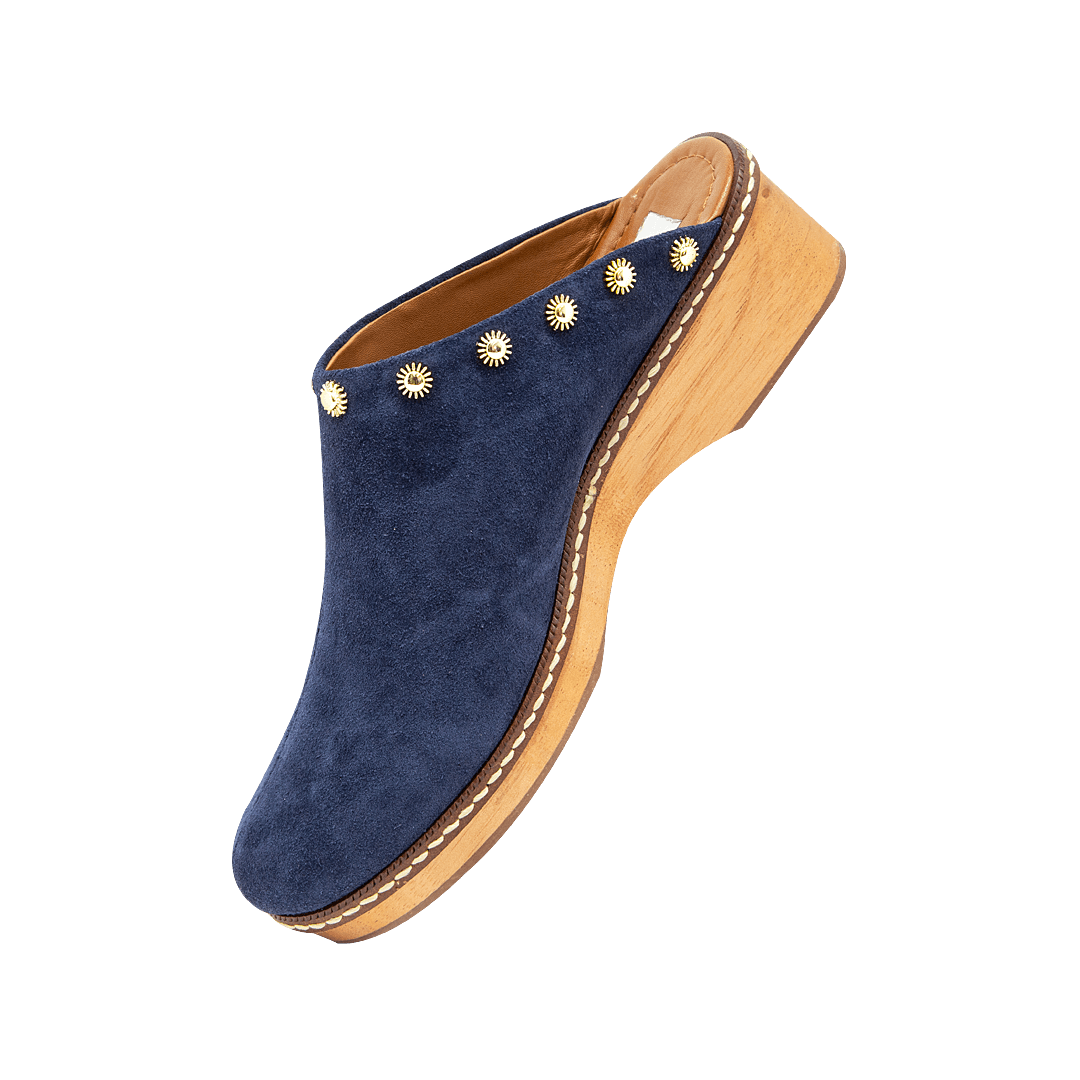 ¡Diseño práctico que no sacrifica el estilo! • Zueco de tacón para mujer en cuero carnaza color azul con taches decorativos • Acabado en punta ovalada • Tacón y plataforma en madera • Hecho a mano en Colombia.