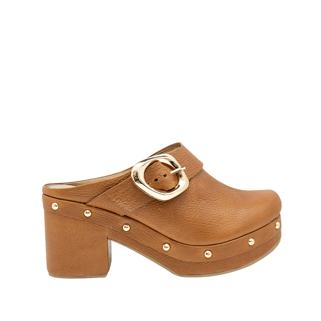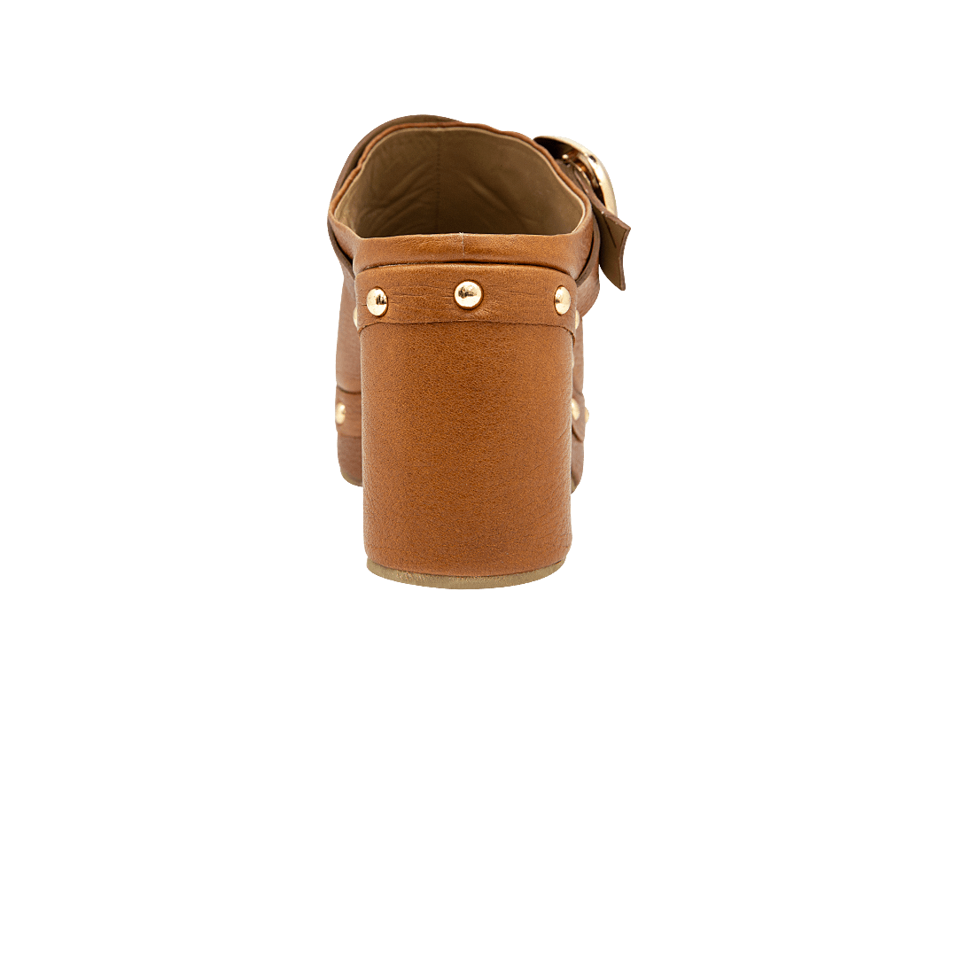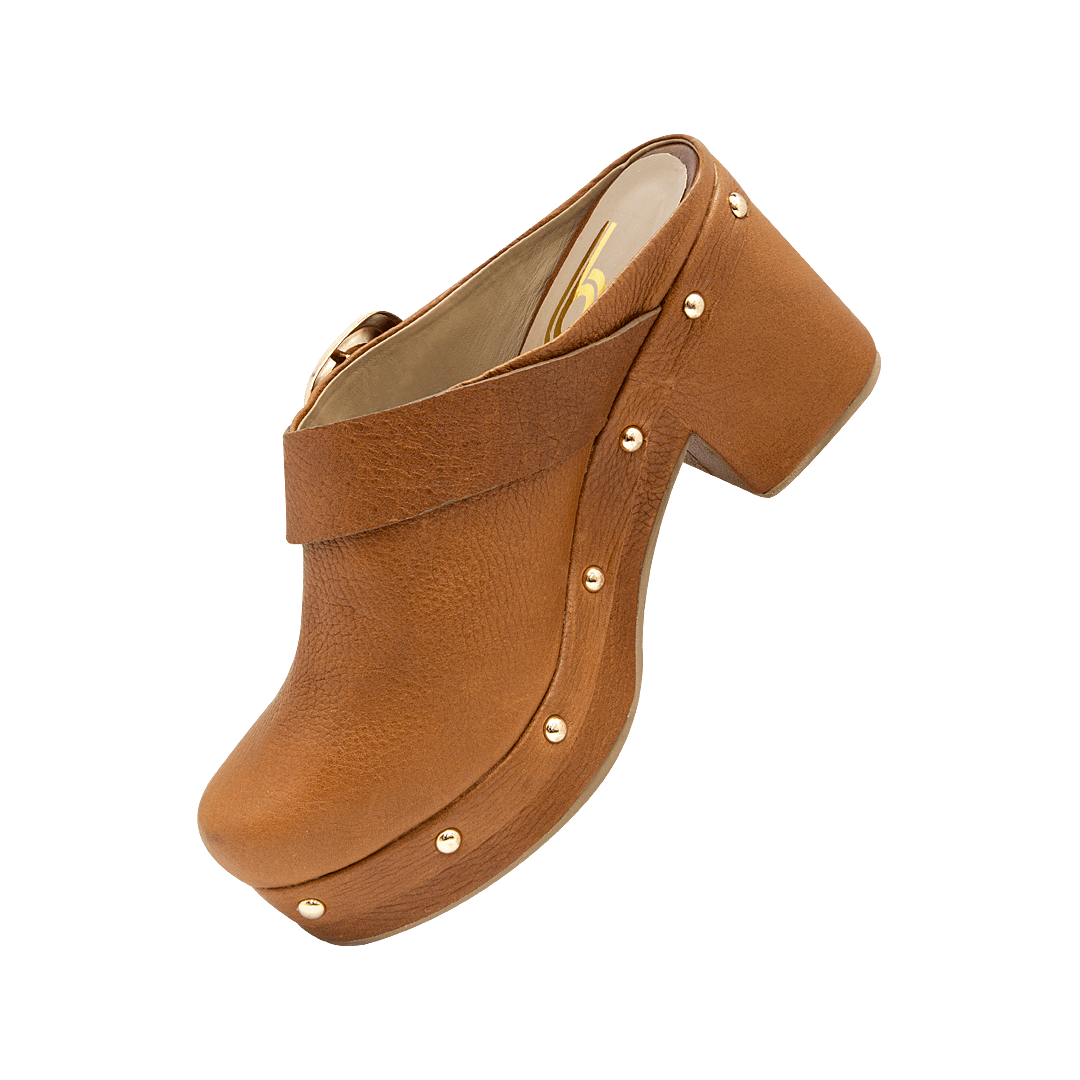 ¡Estilo en cada paso! • Zueco de tacón para mujer en cuero color miel con taches decorativos • Acabado en punta ovalada • Hebilla lateral • Tacón y plataforma forrado en cuero gamuzado • Hecho a mano en Colombia.