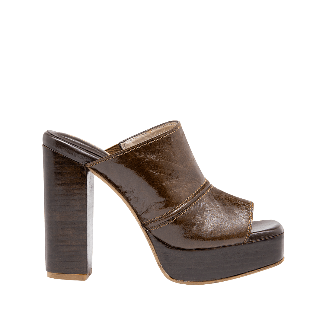 ¡Atrevida y dominante! • Zueco para mujer en cuero color marrón • Acabado en punta cuadrada • Capellada en cuero charolado envejecido • Tacón y plataforma forrado en madera • Hecho a mano en Colombia.